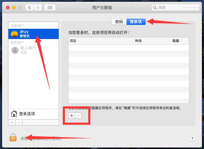 4、依旧是在系统偏好设置→用户与群组→登录项,选择用户,左下角开锁后,去掉不需要的登录项。