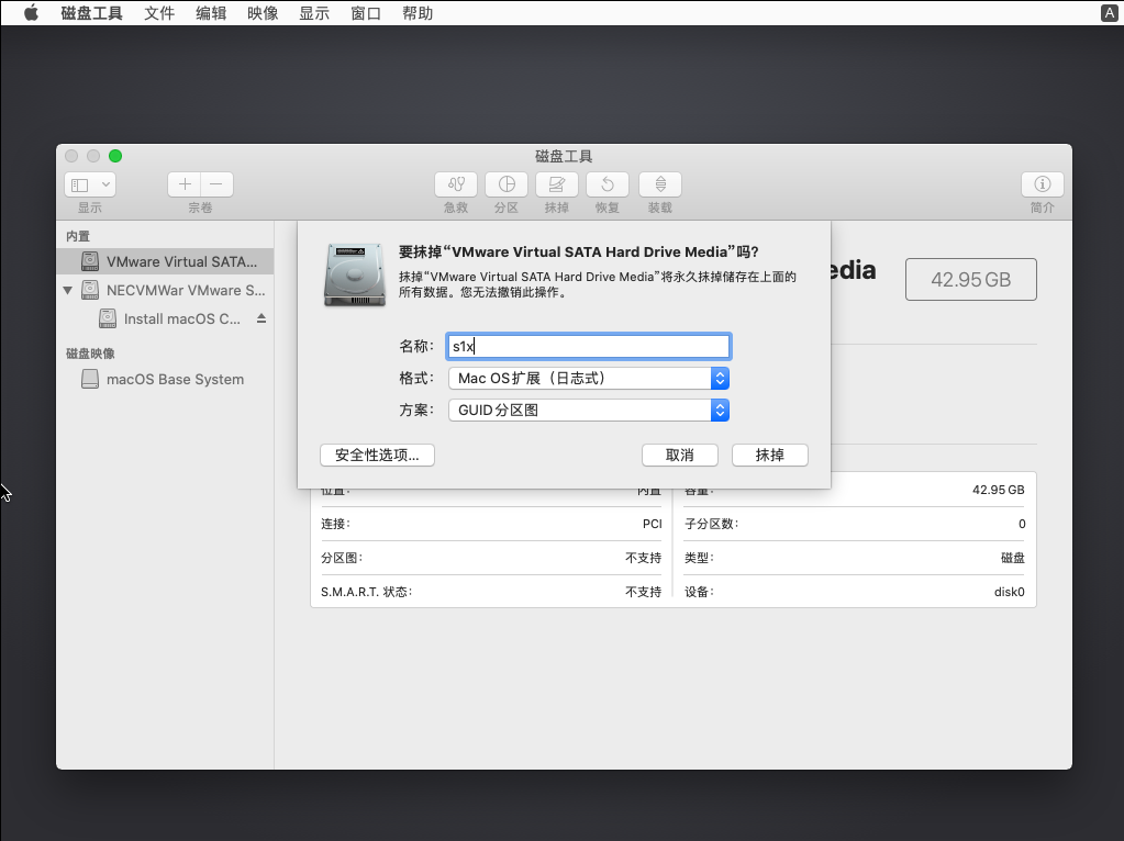 启动系统,选择磁盘工具抹掉刚刚分配的 40G,为硬盘起个名。如下图。