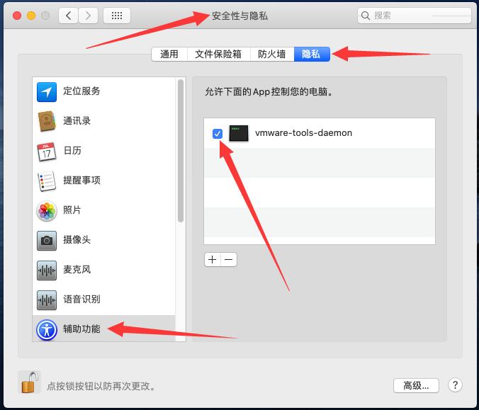 设置成功后拖动虚拟机窗口边界,虚拟机画面会根据虚拟机窗口大小进行自适应,但不会小于设置分辨率。系统提示“系统偏好设置”正在尝试解锁“安全性与隐私”偏好设置时,输入密码,解锁,将 vmware-tools-daemon 打钩即可。