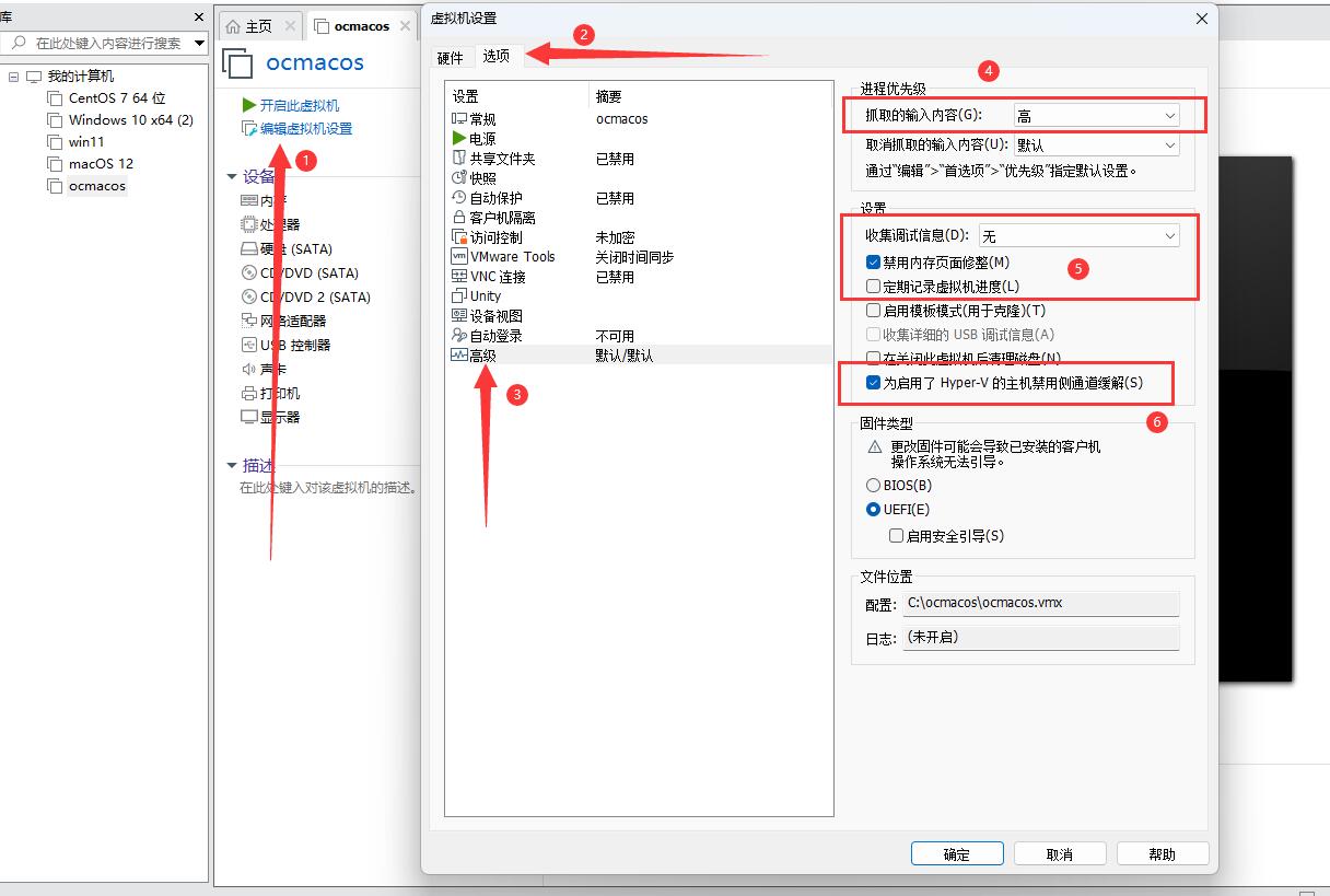 3、在虚拟机设置→选项→高级中,抓取输入内容为高,收集调试信息为无,勾选“禁用内存页面调整”和“为启用了Hyper-v的主机禁用侧通道缓解”,不勾选“定期记录虚拟机进度”,设置完别忘了点击确定。