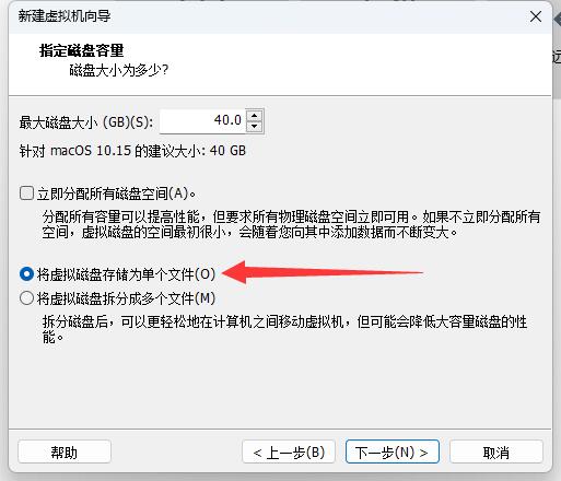 当然你会担心几十乃至上百 GB 的虚拟机会把固态硬盘占满,但实际上虚拟机只有在实际用到存储空间时才会占用实际空间。也就是说虽然你将虚拟机大小设置为 80GB,但只要不勾选"立即分配所有磁盘空间",系统一开始也只会占用 10 多个 GB,80GB 只是该虚拟机占用空间的上限。为保证存储效率,应选择“将虚拟磁盘存储为单个文件”。
