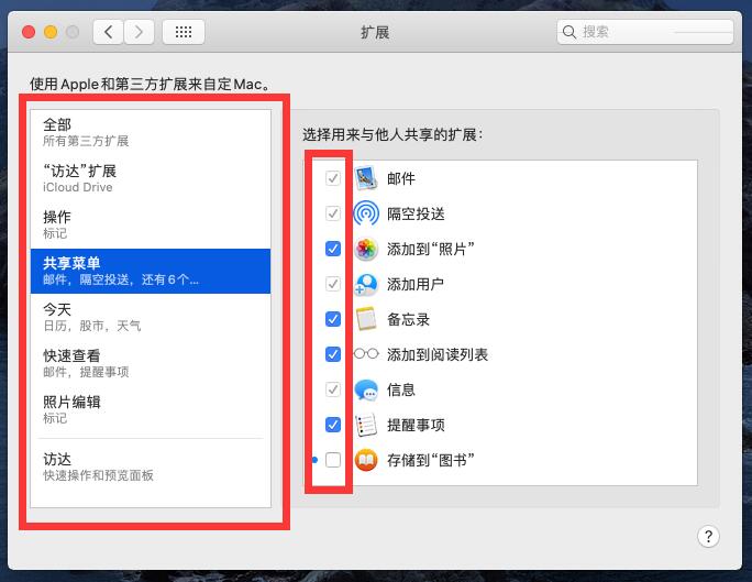3、依旧是在系统偏好设置→扩展,挨个点击左侧目录,将不需要的扩展全部去掉勾选。