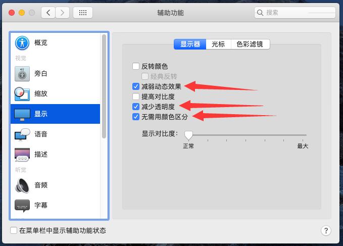 1、系统左上角苹果图标→系统偏好设置→辅助功能→显示,勾选“减弱动态效果”“减少透明度”和“无需用颜色区分”。