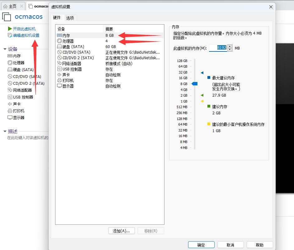 2、在虚拟机设置中,让处理器和内存尽可能的高,会提升一些性能,但这个东西要根据自己的电脑硬件量力而行,大海一般给虚拟机设置 4 核 8G,设置完别忘了点击确定。