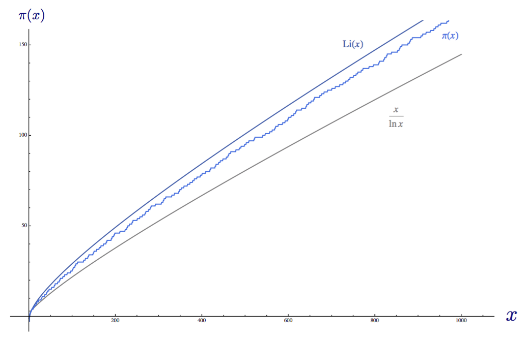 <img src="https://pic2.zhimg.com/v2-ac06bdf50da14cd35c14f9133b6e97ad_b.jpg" data-caption="" data-size="normal" data-rawwidth="1095" data-rawheight="704" class="origin_image zh-lightbox-thumb" width="1095" data-original="https://pic2.zhimg.com/v2-ac06bdf50da14cd35c14f9133b6e97ad_r.jpg"/> 素数计数函数 π(x) 以及素数定理的估计,绘制到 x = 1000
