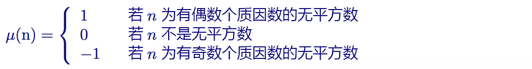 <img src="https://pic2.zhimg.com/v2-75fb5f27051ef96cc26ef7c9c74420e1_b.jpg" data-caption="" data-size="normal" data-rawwidth="1054" data-rawheight="137" class="origin_image zh-lightbox-thumb" width="1054" data-original="https://pic2.zhimg.com/v2-75fb5f27051ef96cc26ef7c9c74420e1_r.jpg"/> 莫比乌斯函数 μ(n) 三个可能的取值