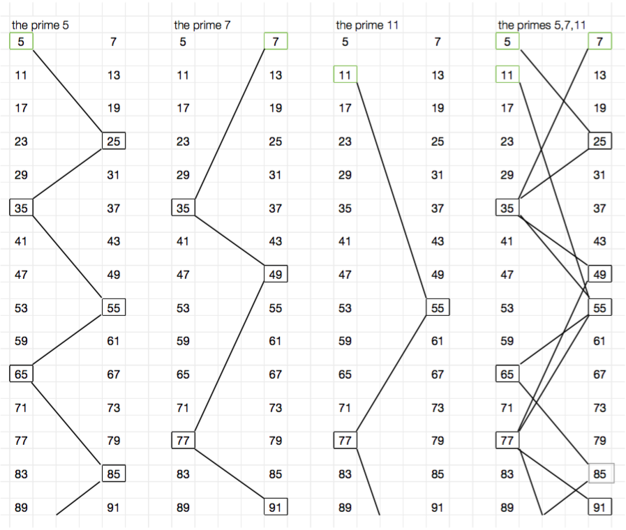 为了从视觉上展示它,我使用了自己称为“合数梯”的东西,它能直观地展现出该函数生成的合数相对于每个素数的布局和组合。在下图的前三列中,你可以清晰地看到素数 5, 7, 11 与它们各自的合数梯一直到 91。第四列的混乱则展示了此筛子如何移除素数以外的所有的数字,它清楚地展现了为何素数如此难以理解。