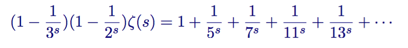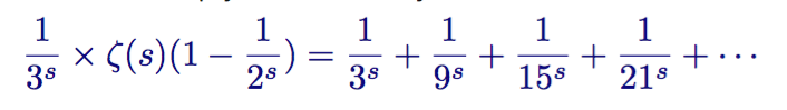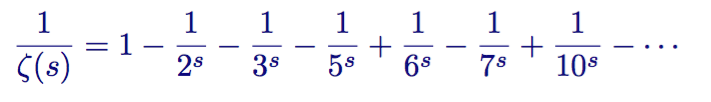 <img src="https://pic4.zhimg.com/v2-2eee2142517c1dc426c503e30b1df09b_b.jpg" data-caption="" data-size="normal" data-rawwidth="711" data-rawheight="102" class="origin_image zh-lightbox-thumb" width="711" data-original="https://pic4.zhimg.com/v2-2eee2142517c1dc426c503e30b1df09b_r.jpg"/> 1除以 zeta 函数 ζ(s) 的级数/求和