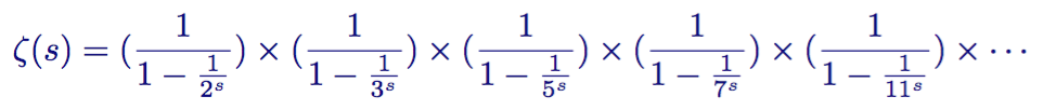 <img src="https://pic2.zhimg.com/v2-44216ad0d56eb337a8e8579c975d1a55_b.jpg" data-caption="" data-size="normal" data-rawwidth="332" data-rawheight="122" class="content_image" width="332"/> 欧拉乘积公式,该恒等式展示了素数与 zeta 函数间的联系