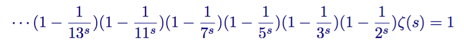 如果你觉得这个过程很眼熟,那是因为欧拉实际上构造了一个筛子,它和埃拉托斯特尼筛法很像。它将非素数从 zeta 函数中筛了出去。接着,将该表达式除以所有素数的倒数项,就得到了:
