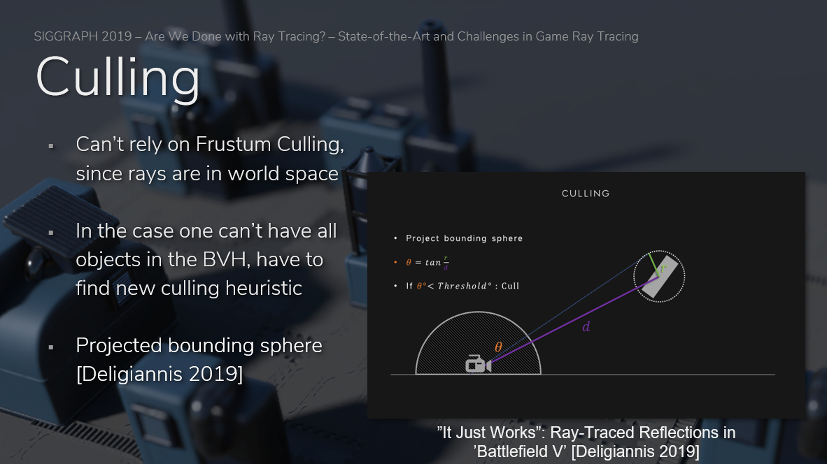 如果无法将所有对象都放在BVH中,则必须找到一种新的启发式剔除方法。《战地5》的方案是基于投影包围球(Projected Bounding Sphere)[Deligiannis 2019],不失为一种有效的方法。