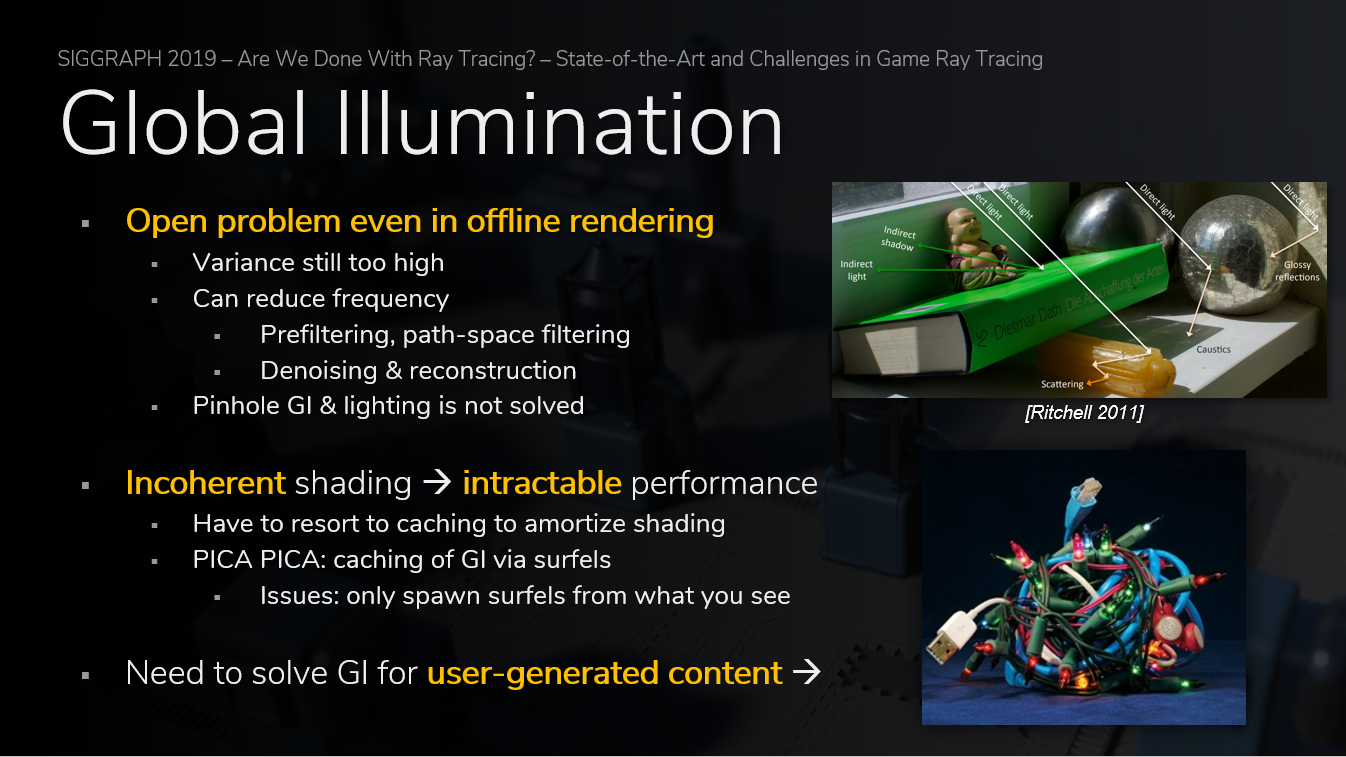 同样,业界也需要解决在不借助任何前期参数化行为的前提下,对用户生成的内容进行稳定的实时光线追踪全局光照的问题。