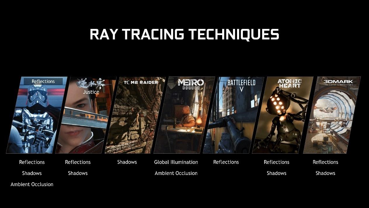 - 到目前为止,不少3A游戏已经加入了实时光线追踪技术,包括《战地5(Battlefield V)》、《使命召唤:现代战争(Call of Duty: Modern Warfare)》、《地铁:离去(Metro Exodus)》、《古墓丽影:暗影(Shadow of the Tomb Raider)》、《雷神之锤2 RTX版 (Quake II RTX)》、《德军总部:新血脉(Wolfenstein: Youngblood)》等。