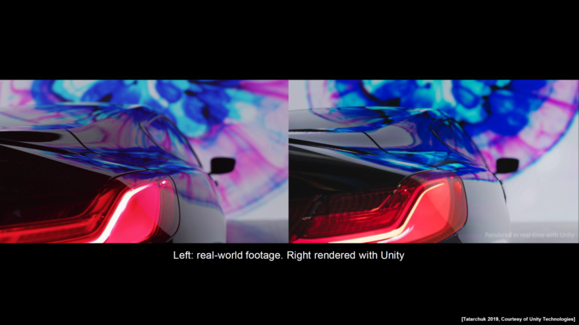 Unity引擎2019年3月发布的《Reality vs illusion: Unity real-time ray tracing》Demo中,将CG汽车与现实世界的汽车同时放在画面中。对比起来,已经很难辨别CG和现实。