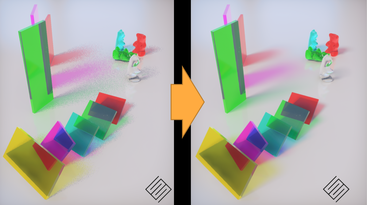 在目前的实时光线追踪领域,在1-2 spp(sample per pixel)的情况下,大多数降噪技术通常对于透明渲染、粒子渲染、体积渲染的渲染效果虽说相较于光栅化有进步,但其实也并算不上特别理想。