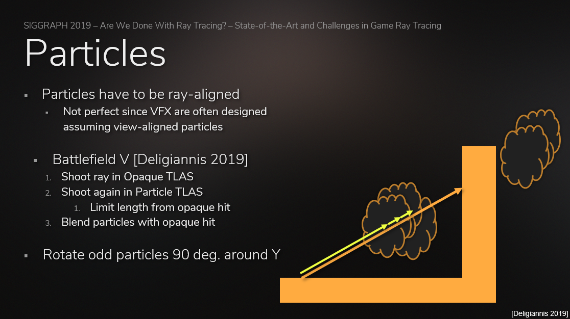 对于光线追踪粒子系统的渲染,《战地5》解决方案是将粒子朝向光线,有点类似billboard的思想。