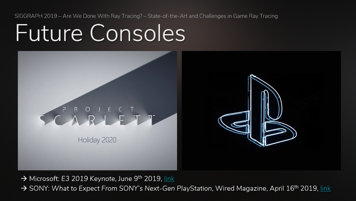当然,两个主要主机制造商的下一代产品,索尼的Play Station 5和微软的Xbox Scarlett,都宣布了对实时光线追踪技术的支持。