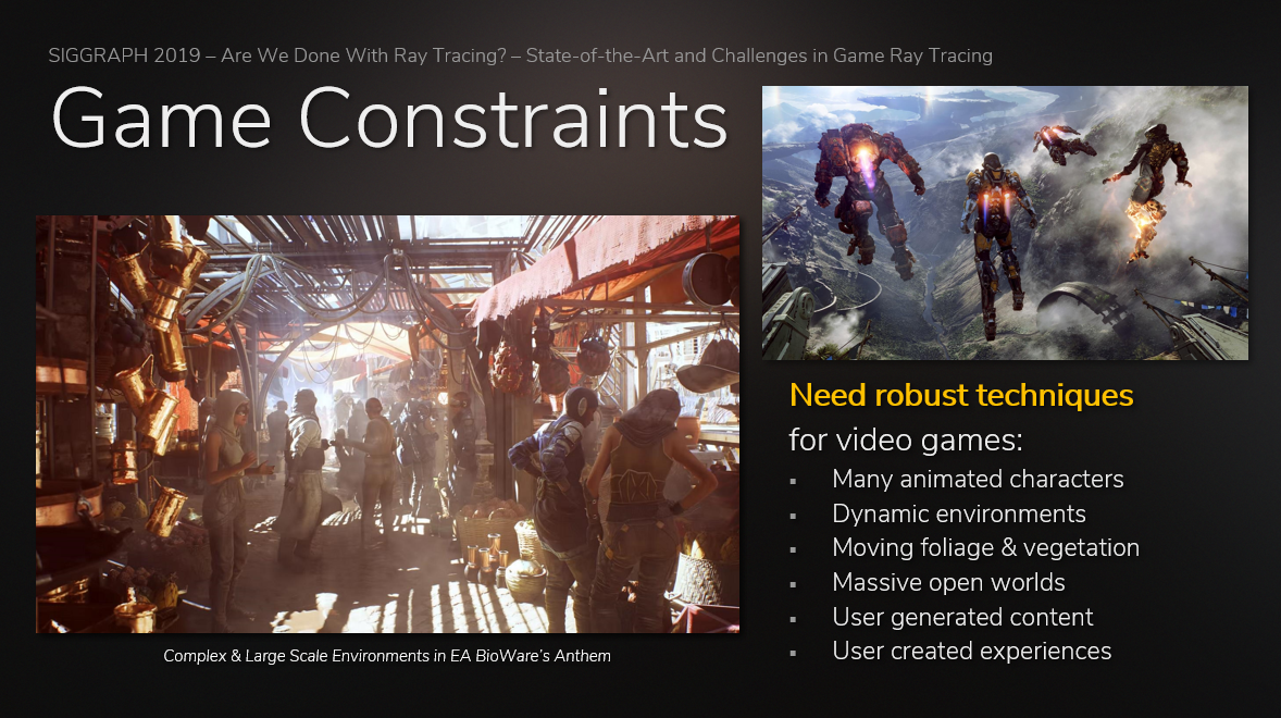 对目前的实时光线追踪领域而言,需要更健壮的技术体系,来支持大量动画角色,丰富的植被,动态的环境,以及对开放大世界,用户生成内容的稳定处理。