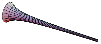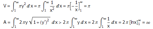 Gabriel 喇叭是 $y=1/x$ 在 $[1, +∞)$ 上的图象沿 $x$ 轴旋转一周所形成的旋转体。这个简单的三维图形有一个奇特的性质:它的表面积无穷大,却只有有限的体积。为了证实这一点,只需注意到:
