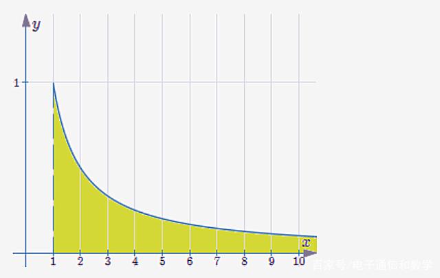 我们选择右侧部分(以避免 $x=0$ 处的不连续性)并绘制从 $x=1$ 开始的图。我们考虑虚线右侧,曲线下方和 $x$ 上方的(无限)阴影区域。