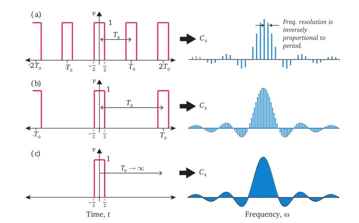 周期函数,可以通过傅里叶级数画出频域图;增长周期,频域图变得越来越密集;当周期无限大,得到傅里叶变换,频域图变为连续的曲线。