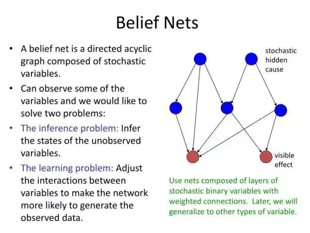 一个简单的信念,或者说贝叶斯网络 —— 玻尔兹曼机器基本上就是如此,但有着非直接 / 对称联系和可训练式权重,能够学习特定模式下的概率。
