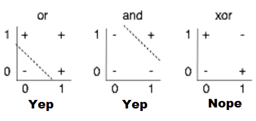 感知机局限性的视觉化。找到一个线性函数,输入 X,Y 时可以正确地输出 + 或 -,就是在 2D 图表上画一条从 + 中分离出 - 的线;很显然,就第三幅图显示的情况来看,这是不可能的。