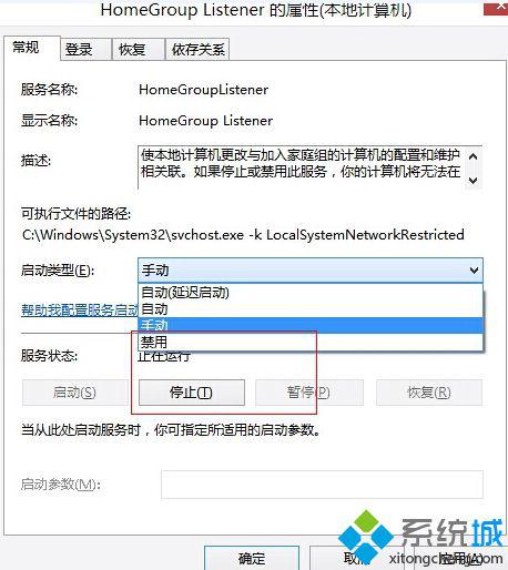 之后会弹出属性窗口,将“启动类型”设置为“禁用”,在服务状态下点击“停止”按钮,然后点击“确定”按钮进行保存,两项服务都禁用后就可以关闭家庭组了。