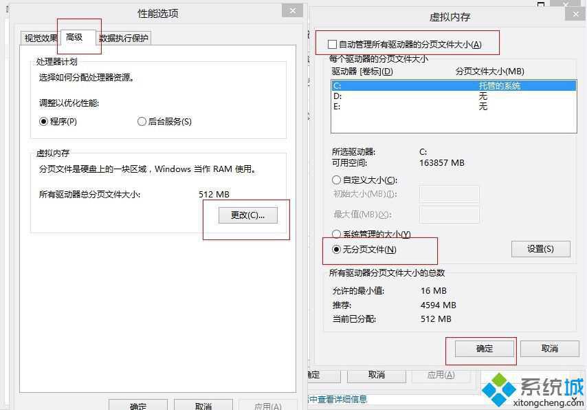 打开性能选项后,切换“高级”选项卡,点击虚拟内存处的“更改”按钮,在性能内存设置中,将“自动管理驱动器的分页文件大小”勾取消,选择“无分页文件”,然后点击“确定”;