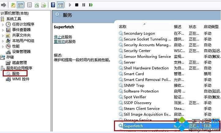 来到计算机管理后,在左侧展开“服务和应用程序”,点击“服务”,然后在右侧的服务列表里找到“Superfetch”服务,双击打开;