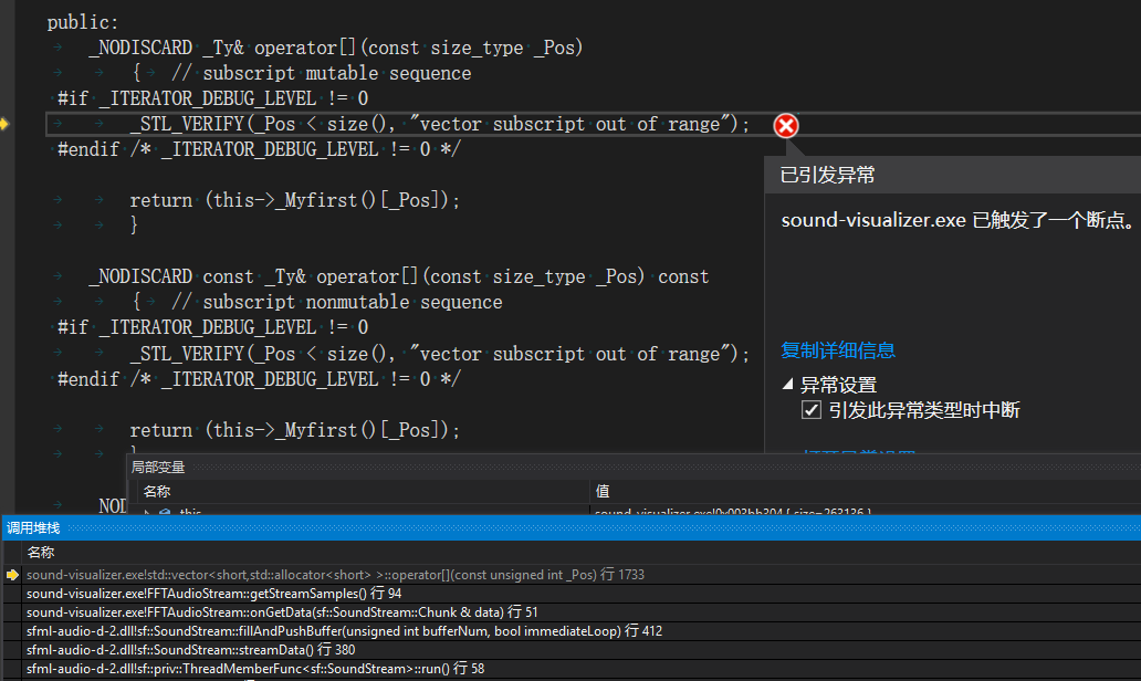 Debug 版本,vector 越界断言,直接定位到代码行。