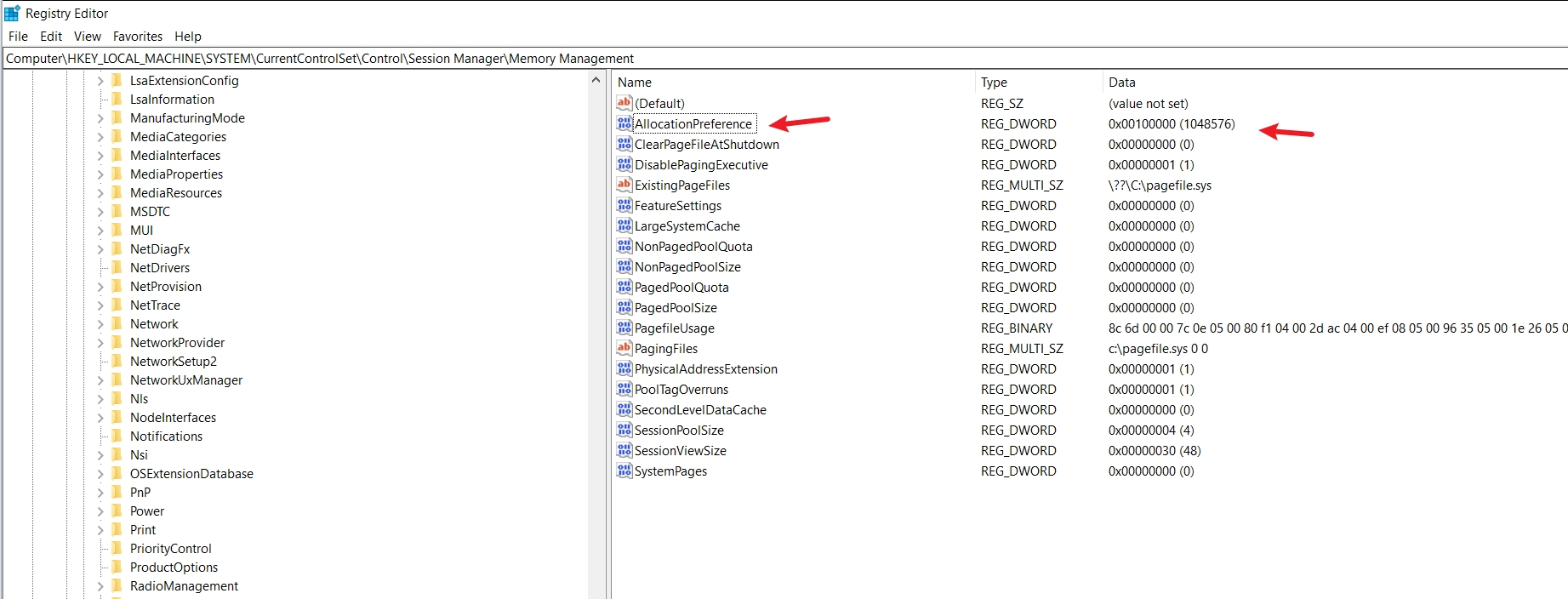 [HKEY_LOCAL_MACHINE\SYSTEM\CurrentControlSet\Control\Session Manager\Memory Management]