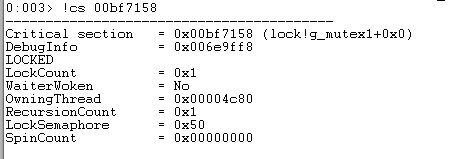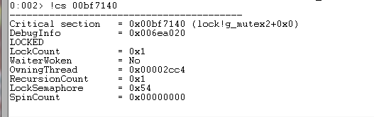 ThreadProc1 lock g_mutex2; 没发生,怀疑是否死锁了!cs 00bf7140 ,查看这把锁信息