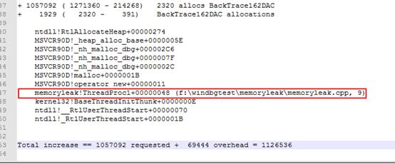 !heap -flt s 224 ,查看 224 这些块被谁在使用!heap -p -a 00971d20 ,查看堆栈lsa memoryleak!ThreadProc1+0x00000048