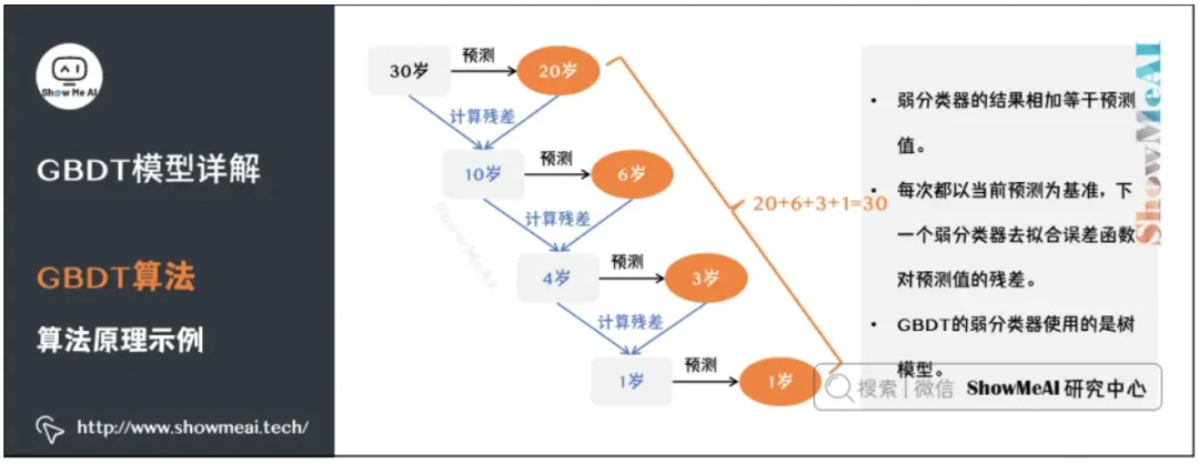 每次都以当前预测为基准,下一个弱分类器去拟合误差函数对预测值的残差(预测值与真实值之间的误差)。