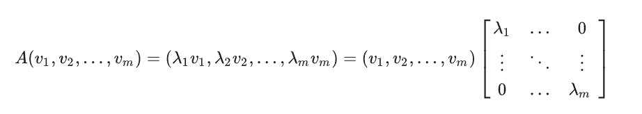 如果方阵 A 的秩为 m,那么就有 m 个特征值,也对应 m 个特征向量(正交)。每一个都满足表达式 \(Av=\lambda v\)。 那么,就可以写成如下形式