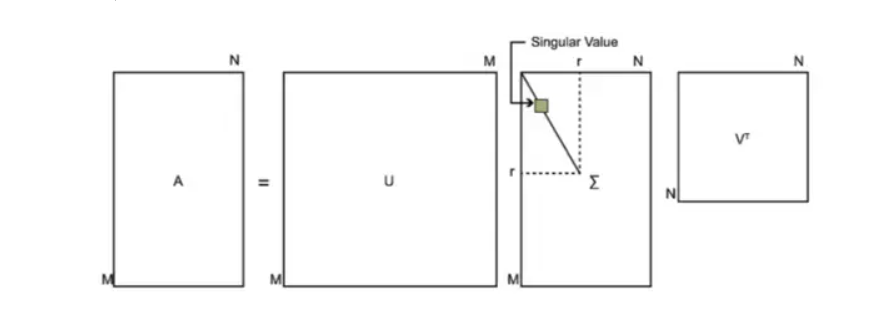 A 是将要分解的大小为 \(m \times n\) 的矩阵。U 是 m 维的方阵。V 是 n 维的方阵。 \(\Sigma\) 是除主对角线元素以外全为 0 的矩阵,大小为 \(m \times n\)。示意图如下: