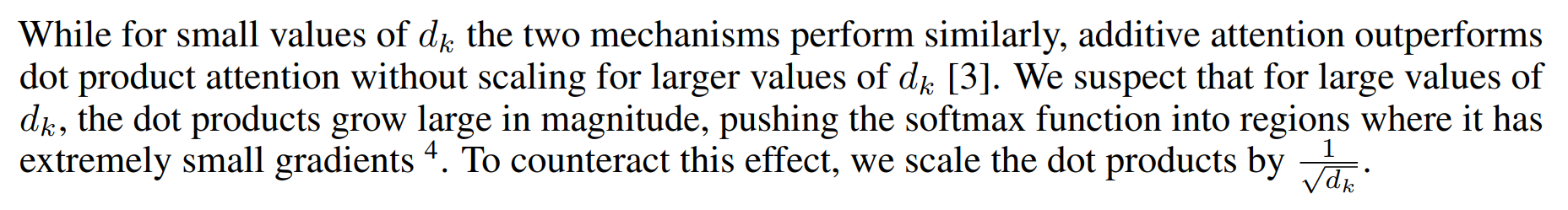 While for small values of $d_k$ the two mechanisms perform similarly, additive attention outperforms dot product attention without scaling for larger values of $d_k$. We suspect that for large values of $d_k$, the dot products grow large in magnitude, pushing the softmax function into regions where it has extremely small gradients. To counteract this effect, we scale the dot products by $\frac{1}{\sqrt{d_k}}$.