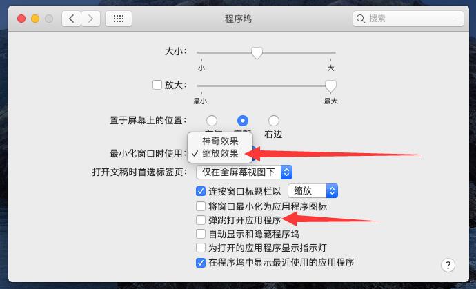 2、依旧是在系统偏好设置→程序坞,最小化窗口时使用“缩放效果”,取消勾选“弹跳打开应用程序”。