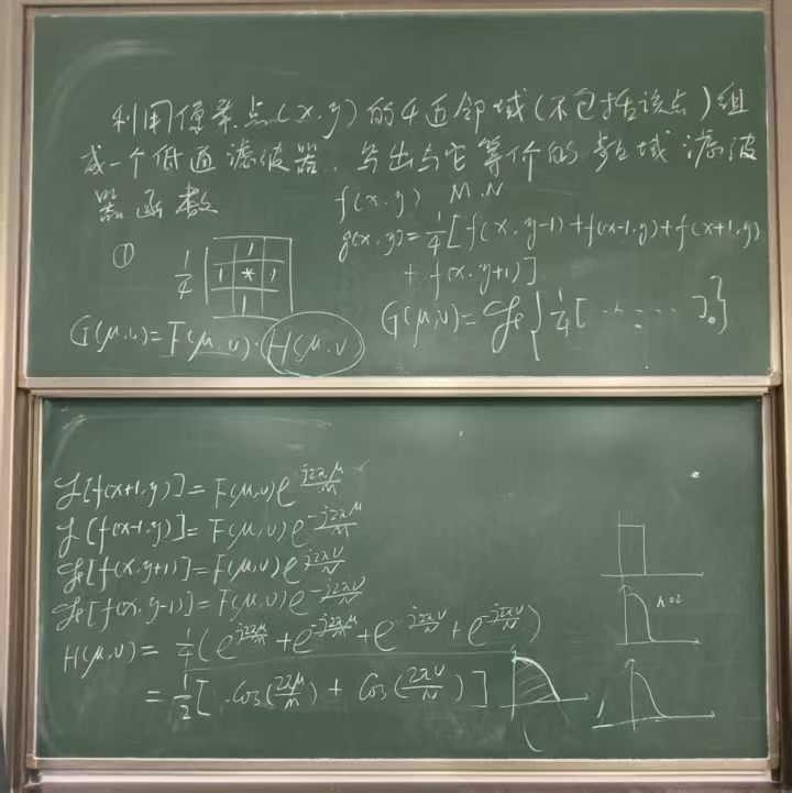 \[\boxed{ g(x,y) =\frac14\Big[ f(x+1,y)+f(x-1,y)+f(x,y+1)+f(x,y-1) \Big] }\]傅里叶“平移公式”。如果 \(f(x,y) \xrightarrow{\mathcal{F}} F(u,v)\)