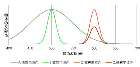 饱和度指颜色的纯度(鲜艳程度),它由主波长的纯光谱色与白光的比例决定,也就是说,夹杂白光的多少。越接近光谱色、白光比例越小,则饱和度越高,色彩越鲜艳醒目;距离光谱色越远、白光比例越大,饱和度越低,色彩越平淡晦暗,越不鲜艳。 如对白光来讲,它的色饱和度为 0(没有色彩),纯色的色饱和度是 100%,指该彩色中不含白光。