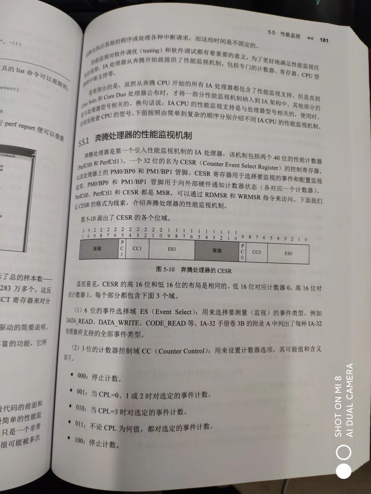 奔腾处理器是第一个引入性能监视机制的 IA 处理器,该机制包括两个 40 位的性能计数器 (PerfCntl0 and PerfCntl1) 一个 32 位名为 CESR(Counter Event Select Register) 的控制寄存器以及处 理器上的 PMO/BP0 和 PMI/BNP1 管脚用于向外部硬件通知计数状态(各对应一个计数器 ).