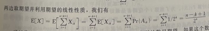 \[E[X] = E\Big[ \sum_{k=0}^{n-1}{X_k}\Big]=\sum_{k=0}^{n-1}{E[{X_k}]} =\sum_{k=0}^{n-1}{Pr[A_k]} =\frac{1}{2^n}( n-\frac{k+1}{2})+\frac{n-k}{2^n}\]