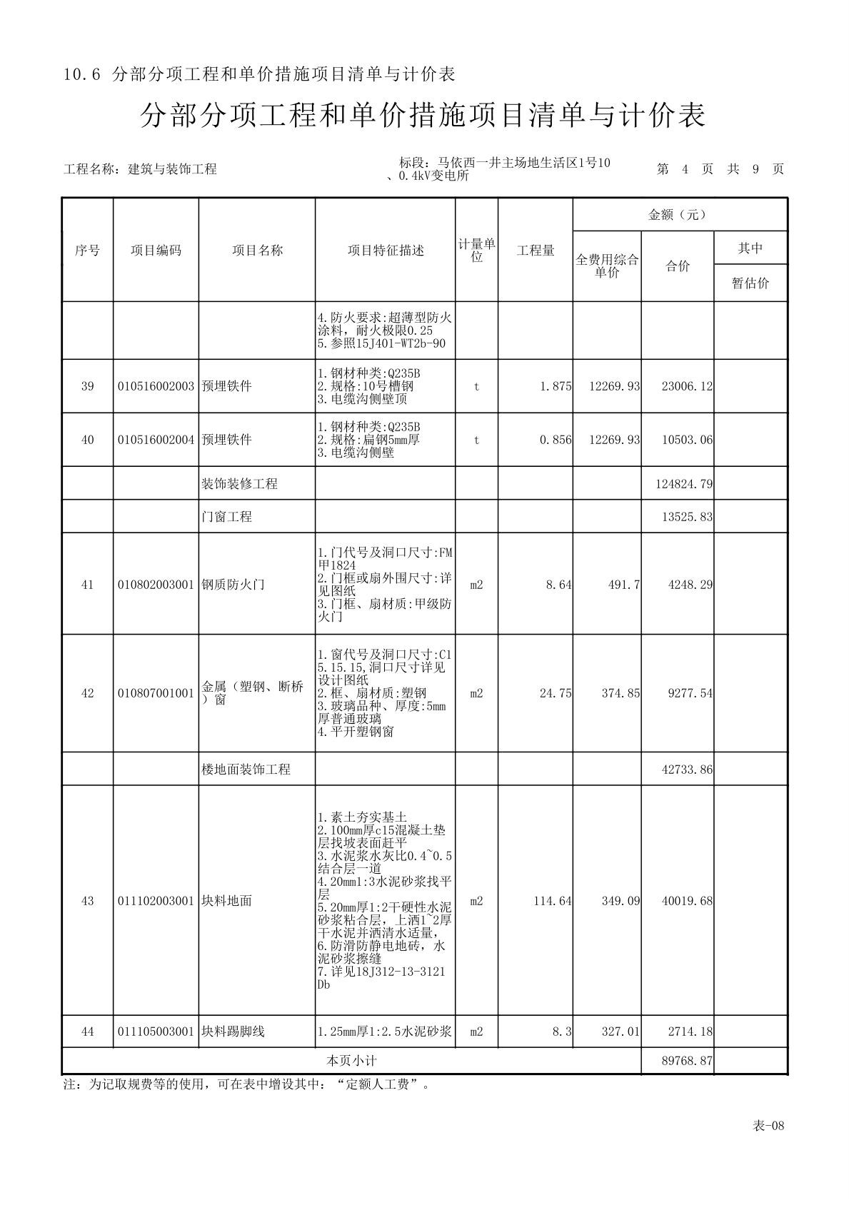 | 序号 | 项目编码 | 项目名称 | 项目特征描述 | 计量单位 | 工程量 | 合价 |