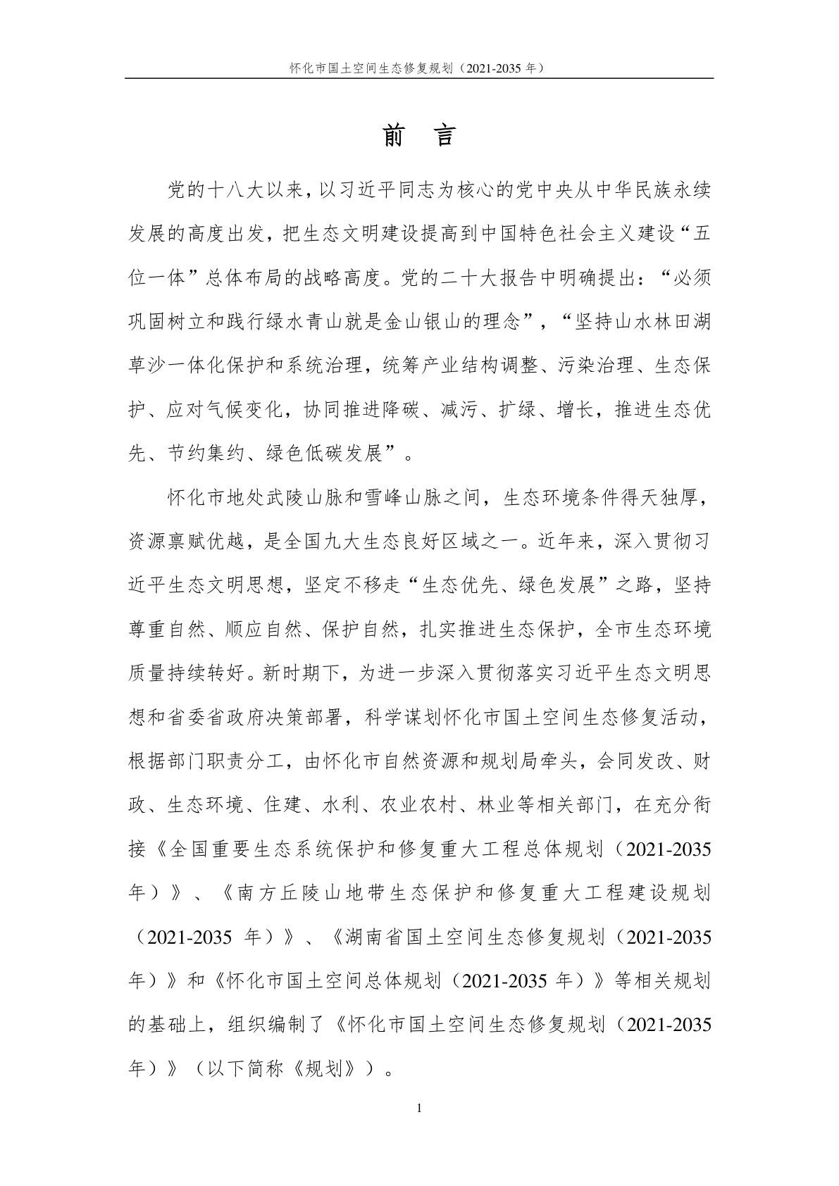 怀化市地处武陵山脉和雪峰山脉之间,生态环境条件得天独厚,资源禀赋优越,全国九大生态系统之一。近年来深入贯彻习近平生态文明思想,坚定不移走 ' 生态优先绿色发展之路 ', 坚持以尊重自然顺应自然保护自然扎实推进建设全市生态环境质量持续好转。新时期为进一步落实习总书记文明思想和省委省政府决策部署科学谋划怀化市国土空间生态修复活动由自然资源和局牵头会同发改财政生态环境住建水利农业农村林业等相关部门充分衔接《全国重要生态系统保护和修复重大工程总体规划 (2021-2035)》等有关规划的基础上组织编制了《怀化市国土空间生态修复规划 (2021-2035)》简称《规泄》。
